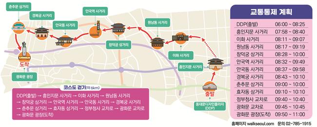 행사 구간은 DDP를 출발해 흥인지문~창덕궁삼거리~경복궁사거리~광화문광장까지 이어지는 6㎞ 코스다. 참가자들은 이날 오전 8시부터 전통과 현대의 미가 조화를 이루는 도심을 안전하게 걷게 된다.