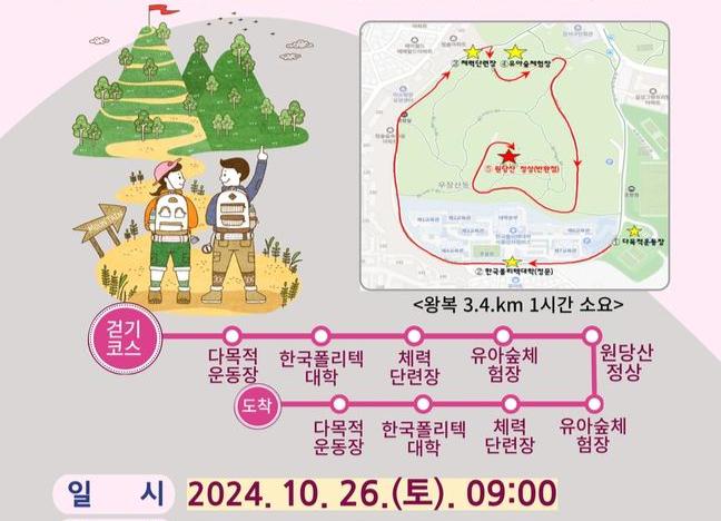 걷기 코스는 우장산 근린공원 다목적운동장을 출발해 한국폴리텍대학, 체력단련장, 유아숲체험장, 원당산 정상을 거쳐 다시 다목적운동장으로 돌아오는 3.4㎞ 코스로, 약 1시간 소요될 예정이다.
