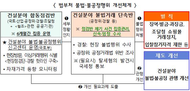 국토교통부는 범부처 건설분야 불법 · 불공정행위 합동점검반을 10월 11일부터 6개월간 운영한다.