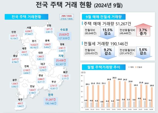 한편 9월 주택 매매 거래량은 51,267건으로 전월 대비 15.5% 감소했으며, 서울의 아파트 매매 거래는 4,951건으로 전월 대비 34.9% 줄어들었다. 전월세 거래량도 감소세를 보이며 전국적으로 190,146건이 거래되었고, 이는 전월 대비 9.2% 감소한 수치다.