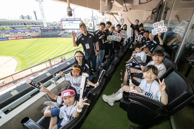 KT가 19일 KT꿈품교실에 참여하는 난청 아동과 가족, 멘토 등 40여명을 초청해 수원 KT위즈파크에서 다양한 문화ž체험활동을 진행했다고 밝혔다. KT꿈품교실에 참여하는 난청 아동과 가족, 멘토 등 KT꿈품교실 구성원들이 단체 응원하는 모습.