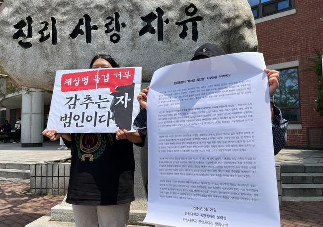 21일 한신대학교 학생들은 “채상병 사망 사건의 진실을 끝까지 밝혀라”며 채상병 특검법을 거부한 윤석열 대통령을 규탄했다.