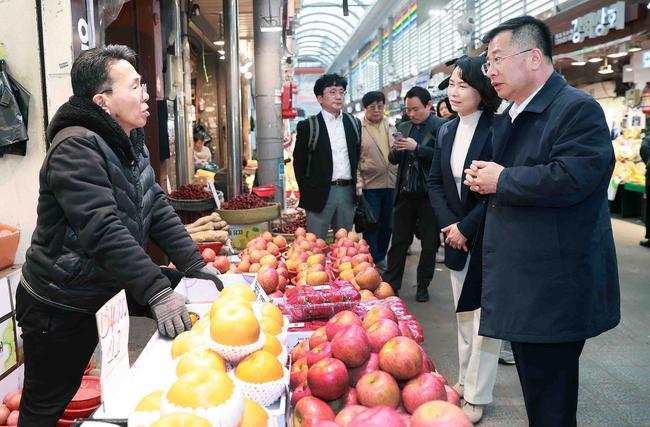 산업부 강경성 1차관이 지난 3월 27일 오후4시, 서울 동대문구 경동시장을 방문하여 과일‧채소 등 신선식품 가격동향을 점검하고 있다.