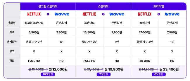 ‘T우주’를 통해 넷플릭스를 구독하는 고객은 넷플릭스의 ▲광고형 스탠다드(5,500원), ▲스탠다드(13,500원), ▲프리미엄(17,000원) 요금제 중 하나를 선택할 수 있으며, 이들 요금제는 각각 웨이브의 콘텐츠 팩(7,900원)과 결합돼 최대 10% 저렴한 가격으로 제공된다.