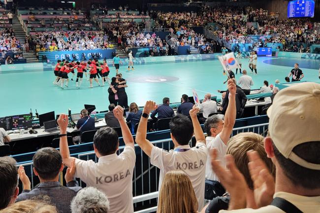 오세훈 시장이 25일, 대한민국에 첫승을 안겨준 여자 핸드볼 경기장을 찾아 응원하고 있다.