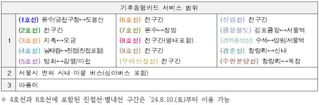 또한, 서울시는 수도권 주민에게 무제한 대중교통 혁신인 ‘기후동행카드’ 서비스를 제공하기 위해 지속적인 노력을 기울이고 있다. 이에 따라 8월 10일(토)부터 ‘기후동행카드’를 8호선 연장구간인 별내선과 4호선 연장구간인 진접선에서도 이용할 수 있게 된다.