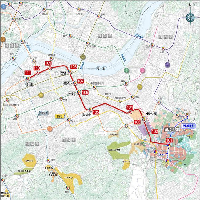 위례신사선 도시철도 노선도 (정거장 위치 등은 개략적인 것이며 향후 사업계획 수립, 공사 단계 등에서 조정될 수 있음)
