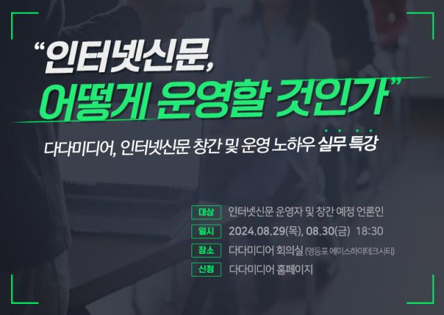 인터넷신문 제작 전문 다다미디어는 오는 8월 29일(목)과 8월 30일(금) 인터넷신문 운영자 및 창간 예정 언론인을 대상으로 `인터넷신문, 어떻게 운영할 것인가`라는 주제의 인터넷신문 운영 및 창간 등록 실무 강좌를 개최한다