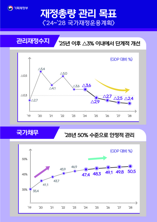 중기 재정건전성 관리도 지속해 2025년 이후 관리재정수지 비율(GDP 대비)은 △3% 이내에서 단계적으로 개선하고, 국가채무 비율(GDP 대비)은 2028년 말까지 50% 수준으로 관리할 계획이다.