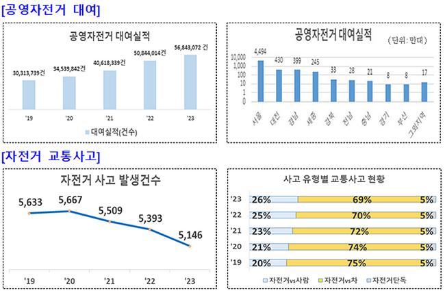 행정안전부는 자전거 이용 활성화를 위한 정책수립·예산 집행과 각종 연구 등에 필요한 주요 통계가 종합적으로 수록된 ‘2023년 기준 자전거 이용 현황’을 공표했다.
