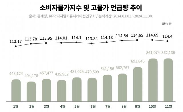 종합 커뮤니케이션그룹 KPR (사장 김주호) 부설 KPR 디지털커뮤니케이션연구소가 623만 건의 소셜 빅데이터를 분석한 결과, ‘고물가’와 관련된 키워드의 언급량이 2024년 1월 44만8124건에서 11월 86만2136건으로 두 배 가까이 늘었다. 같은 기간 소비자물가지수와 비교한 결과, 11월 소비자물가지수는 114.4로 상승세는 둔화됐으나 물가에 대한 소비자의 관심도는 높은 것으로 나타났다.