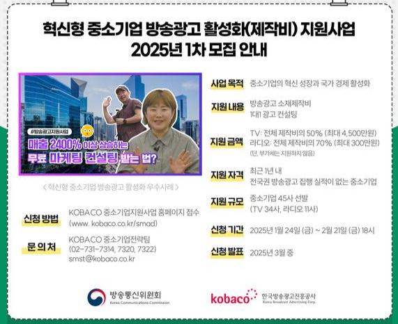 방송통신위원회는 한국방송광고진흥공사와 함께 중소기업과 소상공인의 방송광고 제작 및 송출비를 최대 90%까지 지원하는 ‘2025년 방송광고 제작지원사업’ 공개 모집을 1월 24일부터 시작한다고 밝혔다.