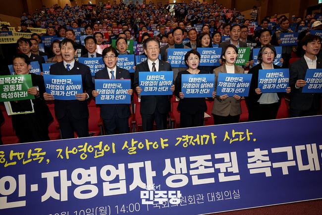 이재명 당대표가 2025.03.10.(월) 국회 의원회관 대회의실에서 열린 중소상공인 · 자영업자 생존권 촉구대회에 참석하여 피켓을 들고 구호를 외치고 있다.
