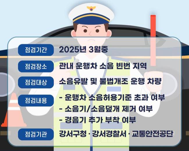 서울 강서구(구청장 진교훈)는 주거환경 개선을 위한 `차량 소음 합동 단속`에 나선다.