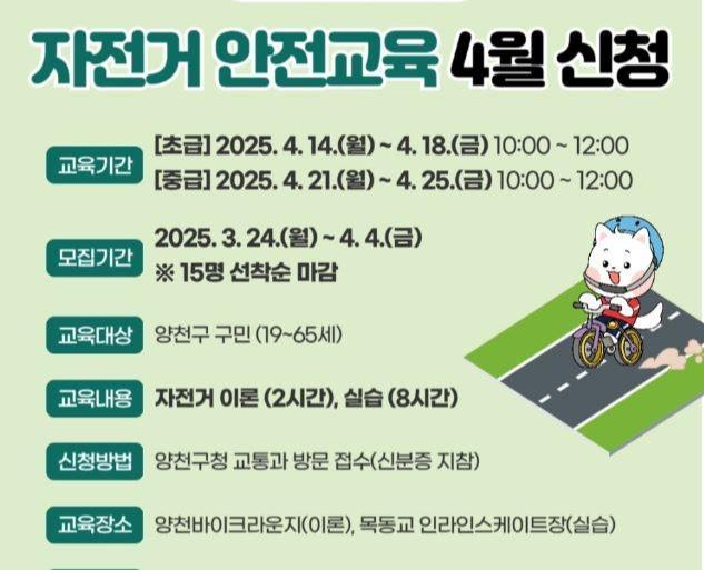 구는 안전한 자전거 이용 문화 확산을 위해 양천구 거주 성인(19세∼65세)을 대상으로 `자전거 안전교육`도 운영한다. 올해 교육 기간은 4월부터 10월까지며, 양천바이크라운지와 목동교 인라인스케이트장에서 무료로 진행된다.